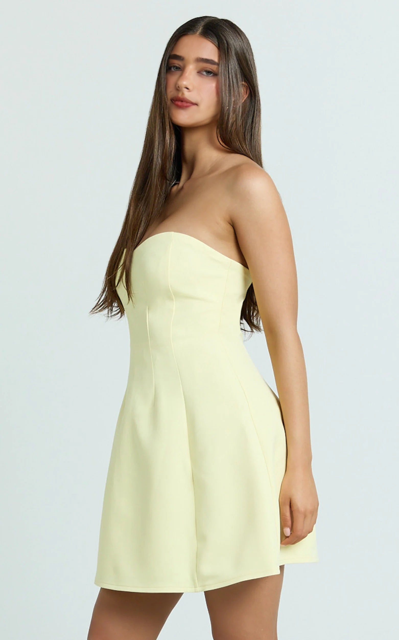 This lemon - colored strapless A - line mini dress is a great choice when you want an easy - to - wear yet impactful outfit. Its loose shape hugs the waist gently and then flares out, suitable for brunches, parties, and other events. You can add some layered delicate jewelry and a sleek ponytail to embrace the modern dress style, or apply a bold lipstick to make the look even more eye - catching.