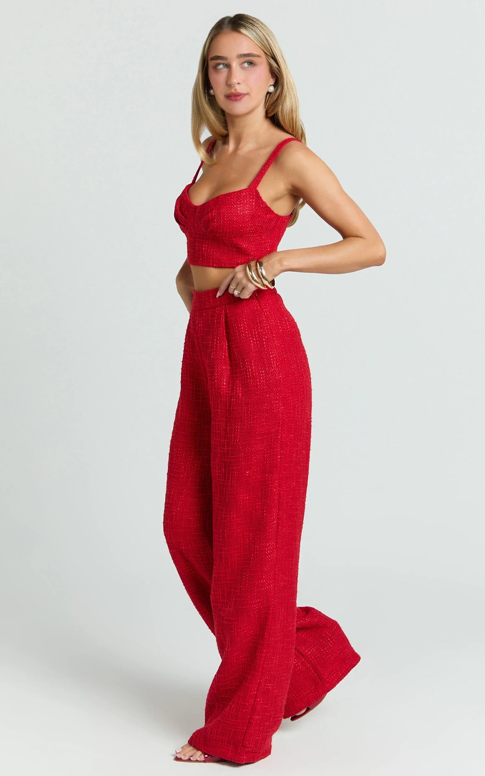 Sylvia Two Piece Set - Corset Top And High Waisted Wide Leg Pants Set In Red is your shortcut to a power moment, mix and match the corset with crisp shirting for daytime or wear the full set for a striking co-ord pants vibe. The saturated red hue makes a statement with zero fuss, while the wide leg fit balances the fitted bodice for a flattering proportion every time.